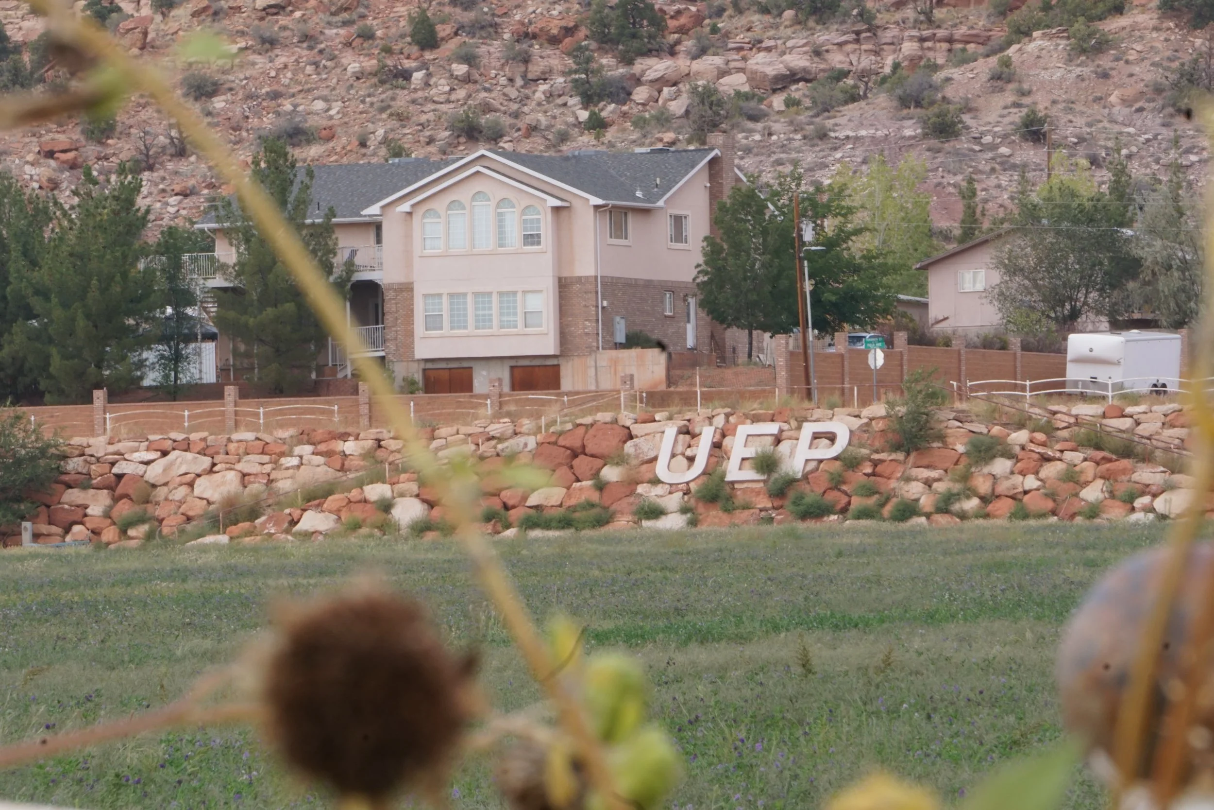 ‘UEP’ letters above a field in the center of Hildale, Utah.